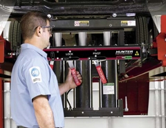 Hunter Swing Air Jacks add capabilities for lifting vehicles off the runways during alignment procedures and other multi-service operations. The heavy-duty Swing Air Jack has a capacity of 9,000 lbs. (4,082 kg) and combines low drive-on height with high lifting capacity needed to handle a wide range of vehicles.